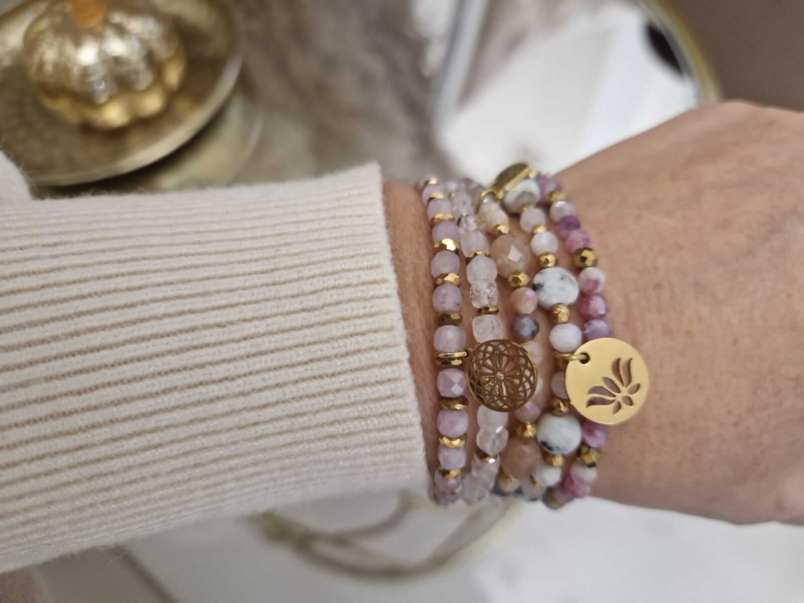 Zacznij od prostej kulkowej bransoletki — np. z różowego kwarcu, jadeitu lub hematytu. To ona będzie fundamentem całego stacku.