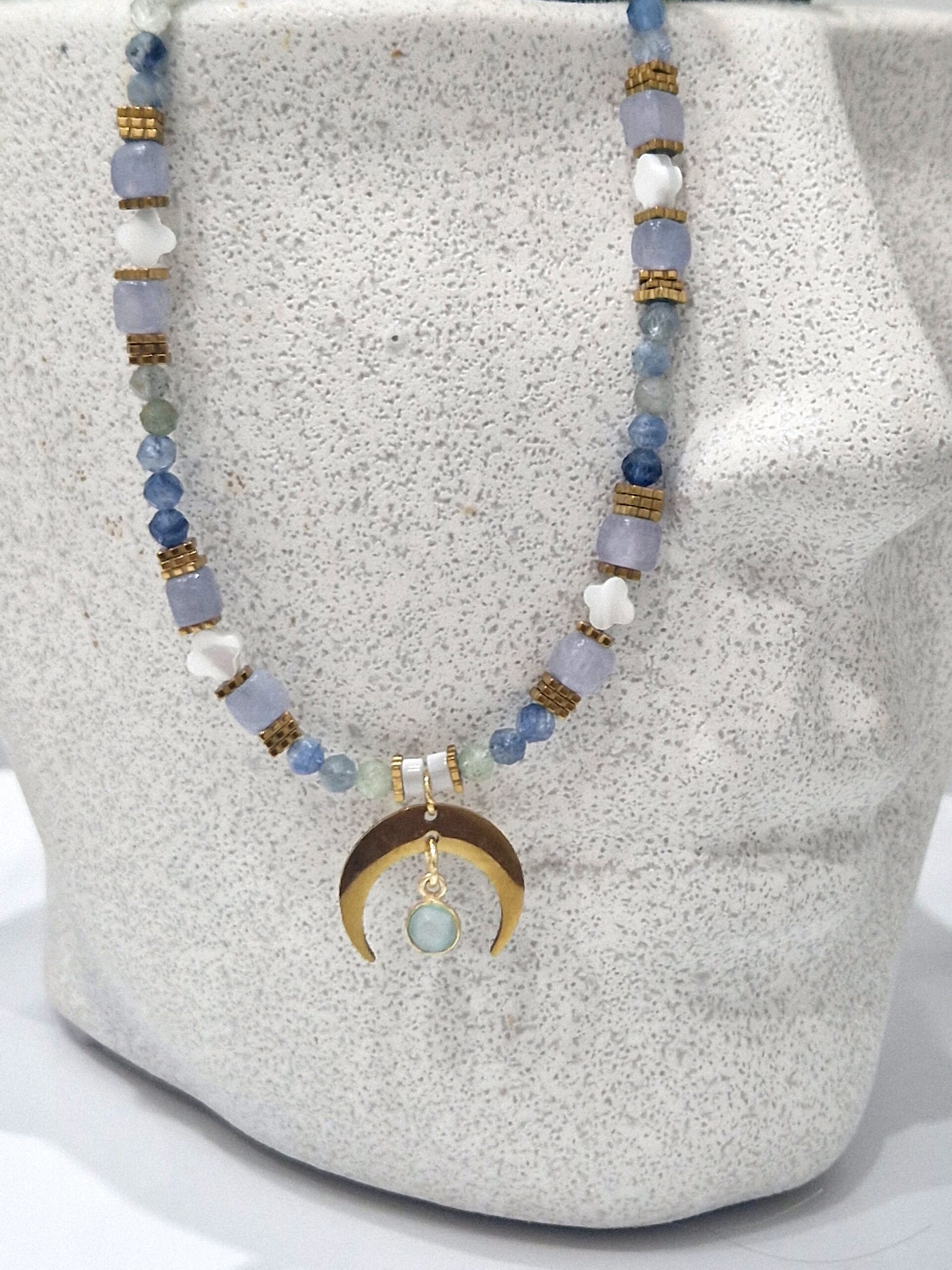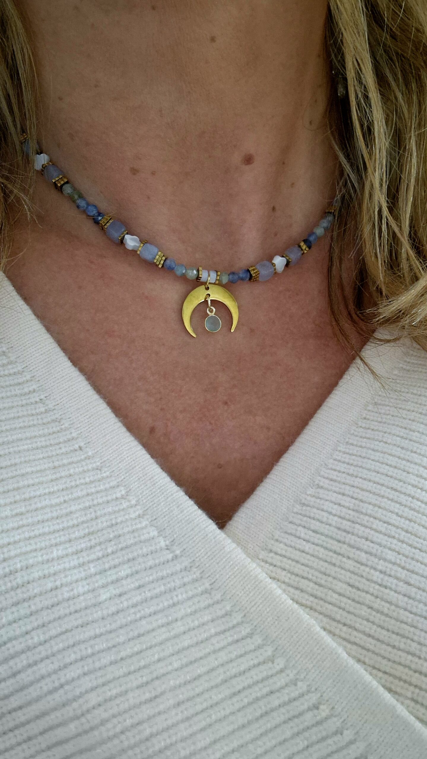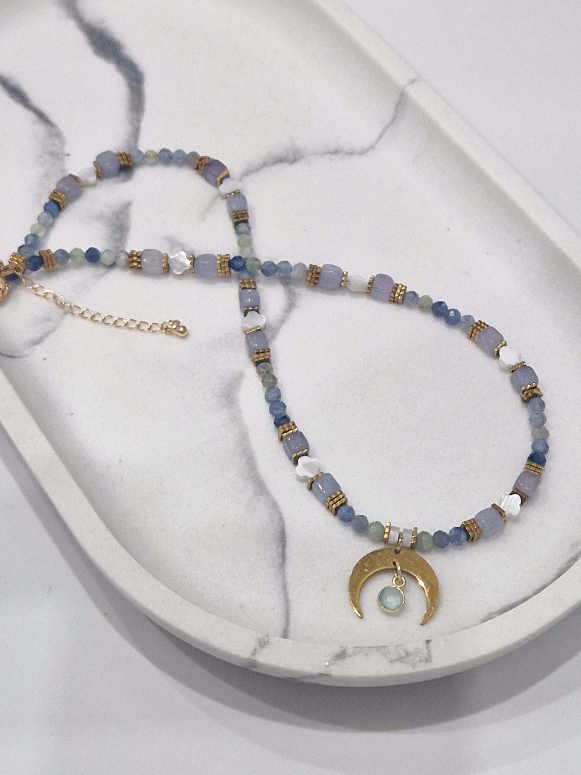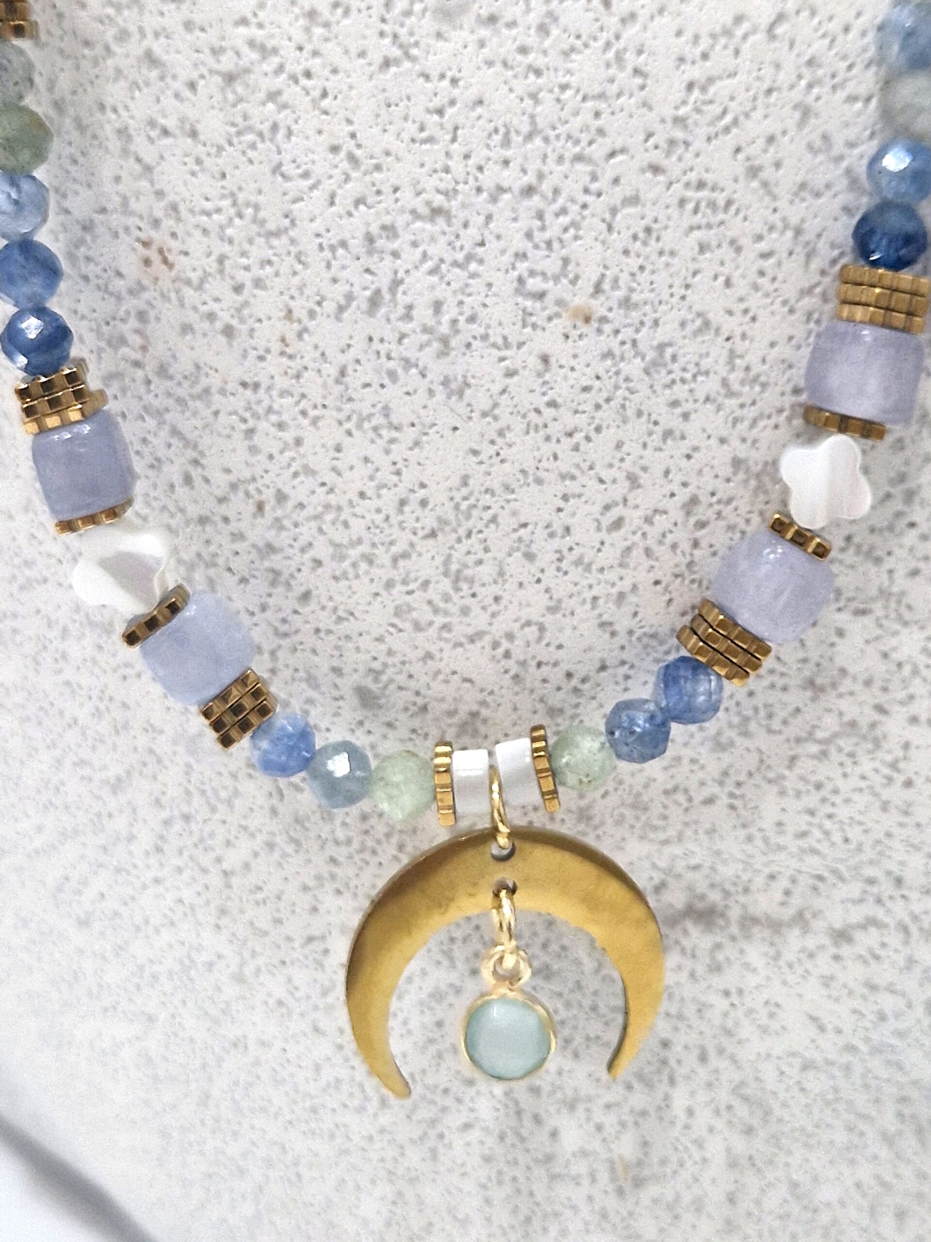 Złote akcenty podkreślają blask kamieni, a półksiężyc z zawieszką nadaje mu wyjątkowego, mistycznego charakteru 🌙