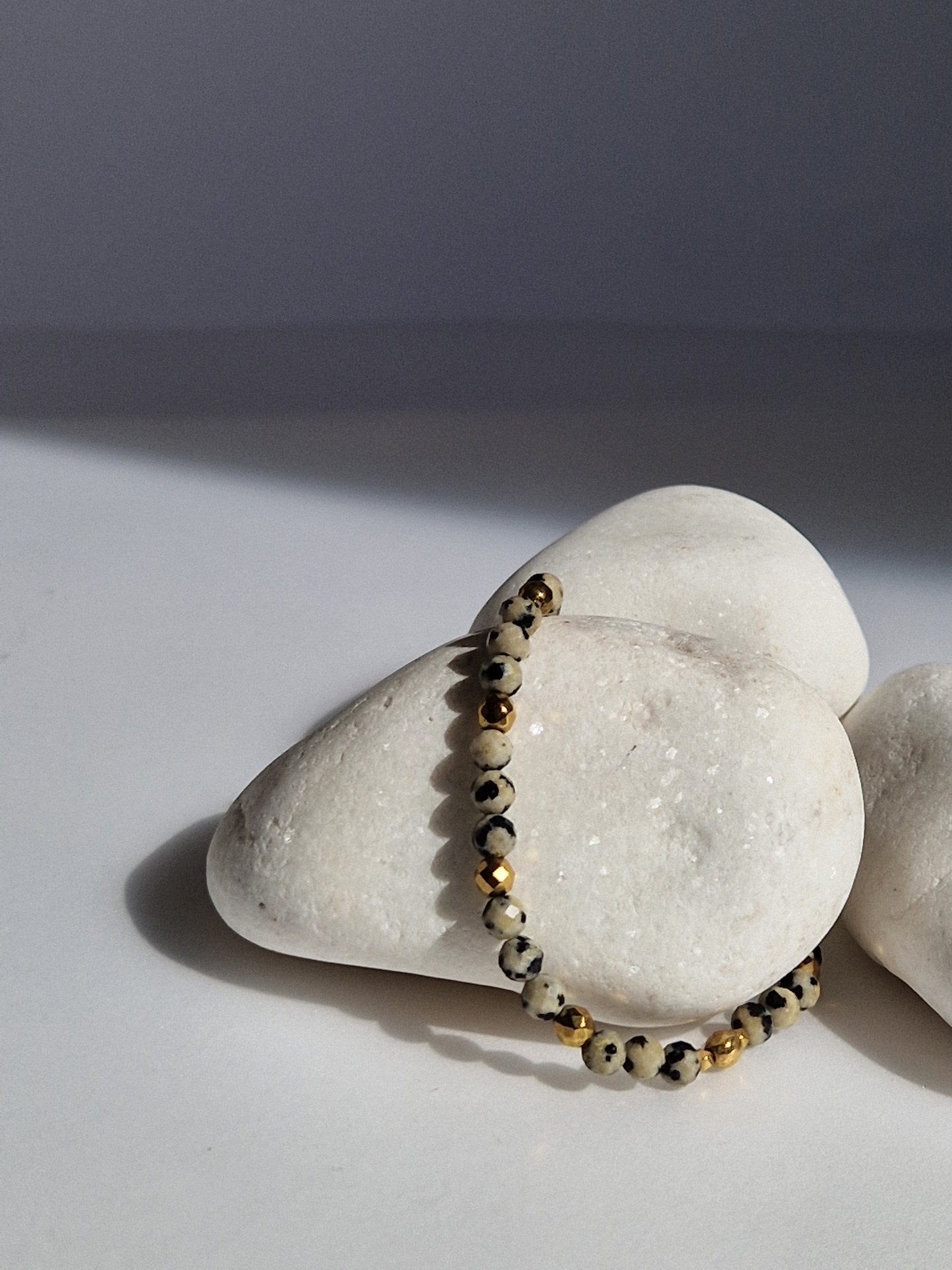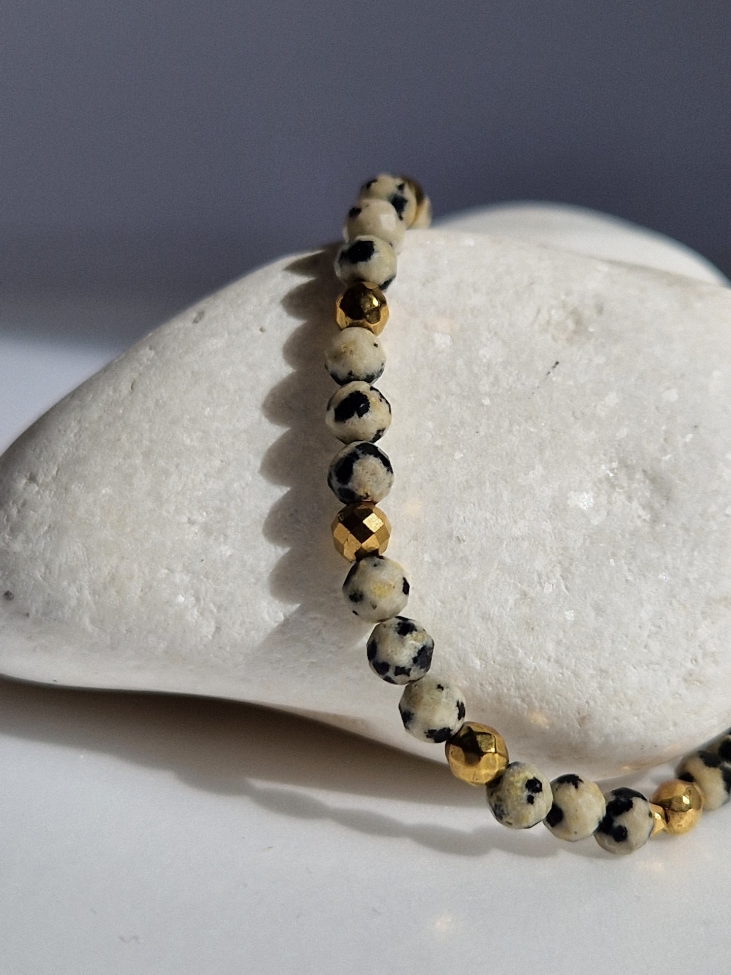 Elegancka i pełna energii bransoletka wykonana z naturalnego jaspisu dalmatyńskiego w połączeniu z subtelnymi dodatkami hematytu. Kamienie zostały starannie dobrane, aby nie tylko pięknie się prezentowały, ale również niosły ze sobą wyjątkowe właściwości energetyczne. Jaspis dalmatyński wyróżnia się charakterystycznym nakrapianym wzorem, który nadaje bransoletce unikatowy charakter, natomiast hematyt dodaje jej elegancji oraz metalicznego blasku.