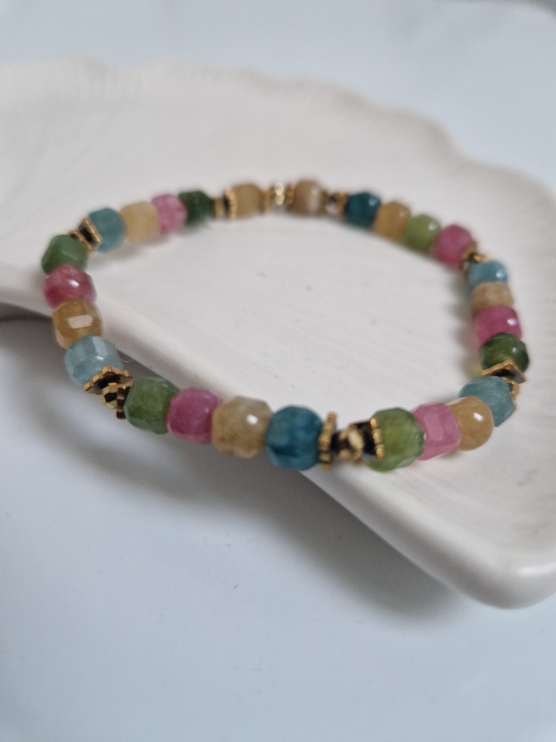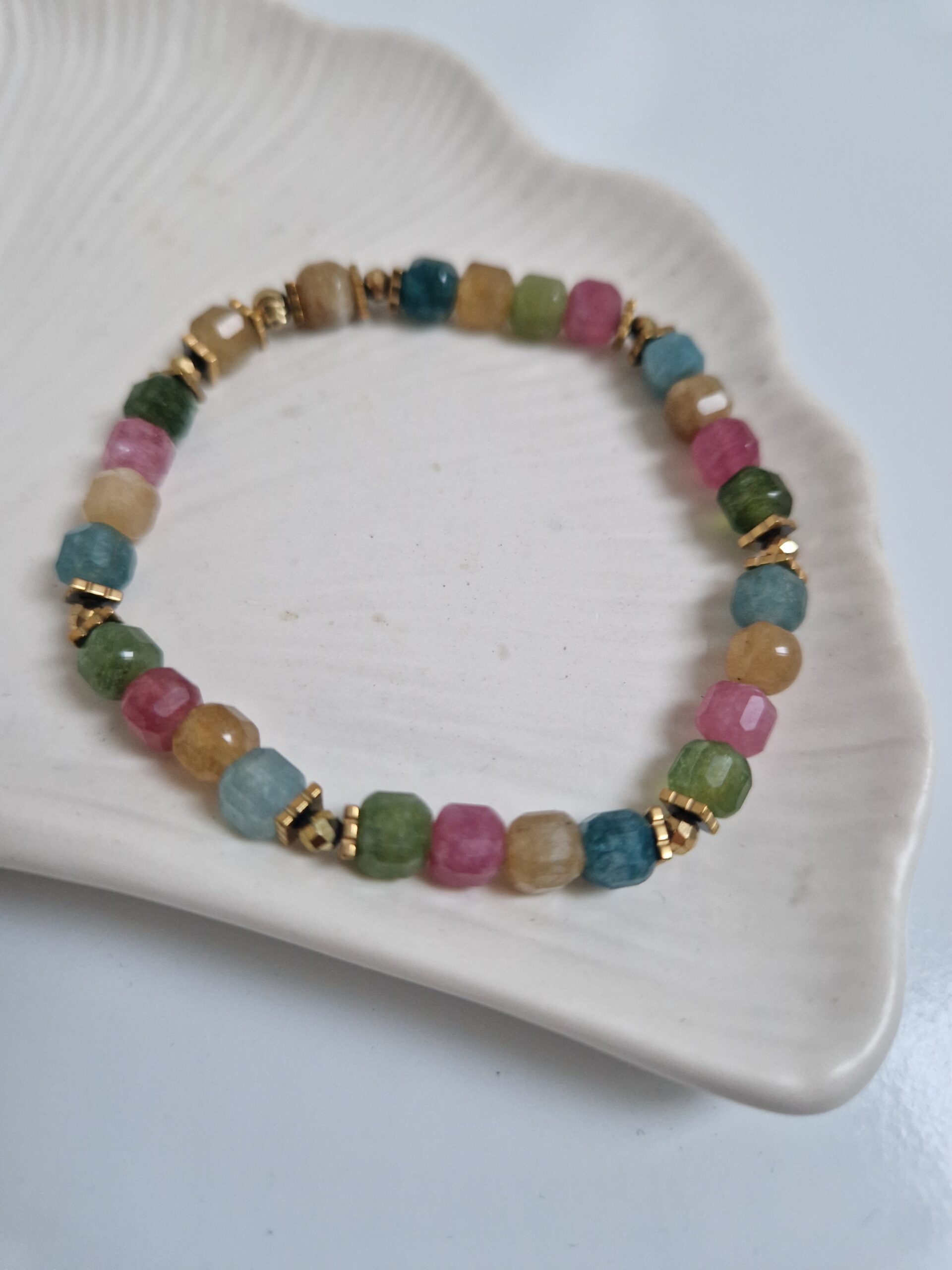 Odkryj wyjątkową bransoletkę wykonaną z naturalnych, kolorowych turmalinów, które zachwycają swoją różnorodnością i delikatnym blaskiem. Każdy kamień jest unikatowy — od pastelowych różów, przez zielenie, aż po głębsze odcienie, tworząc harmonijną kompozycję pełną pozytywnej energii.