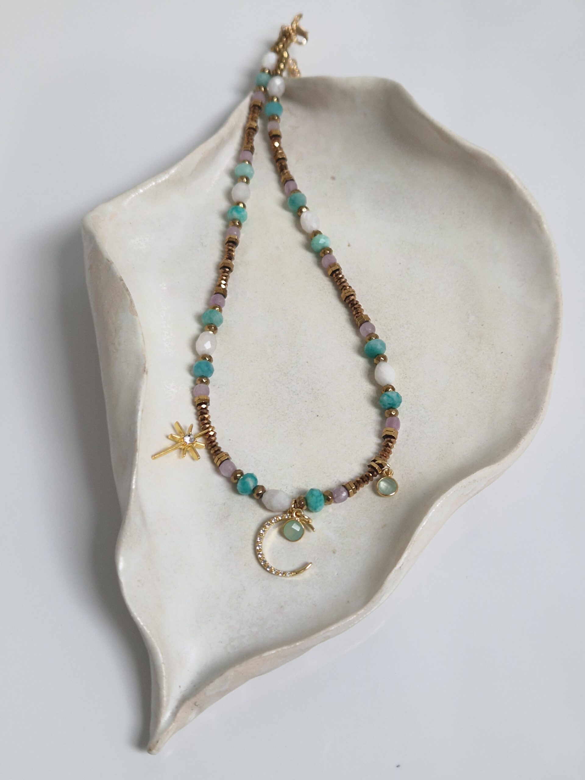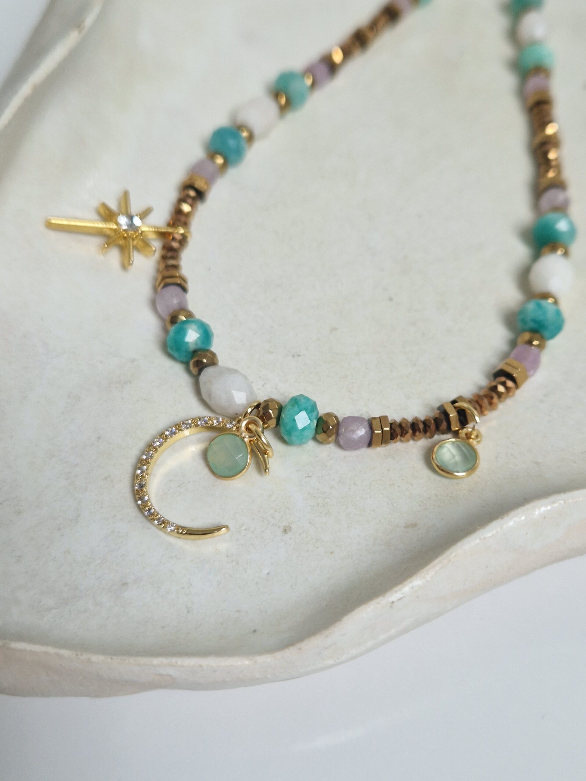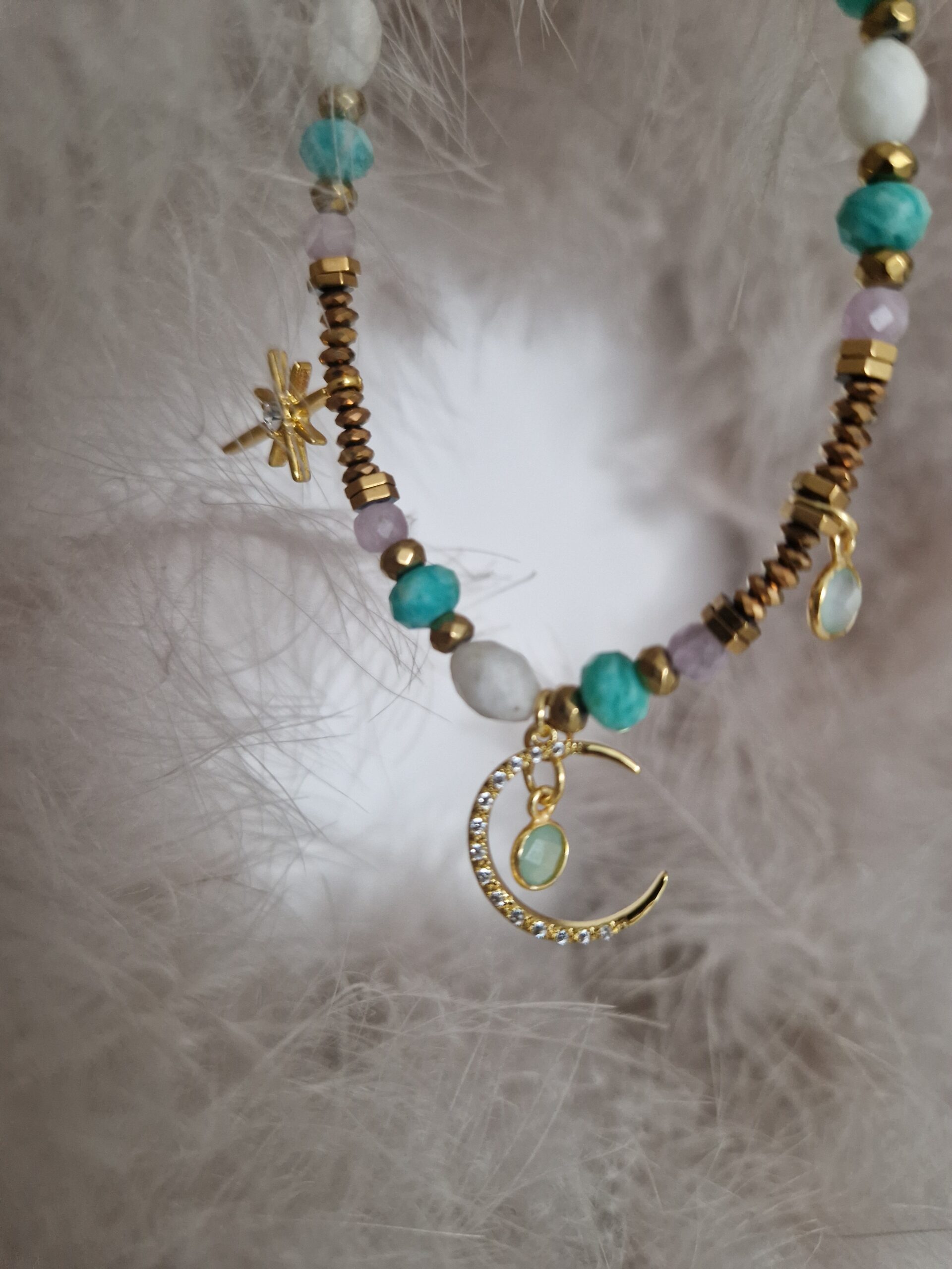 Choker z amazonitu, kunzytu i kamienia księżycowego
